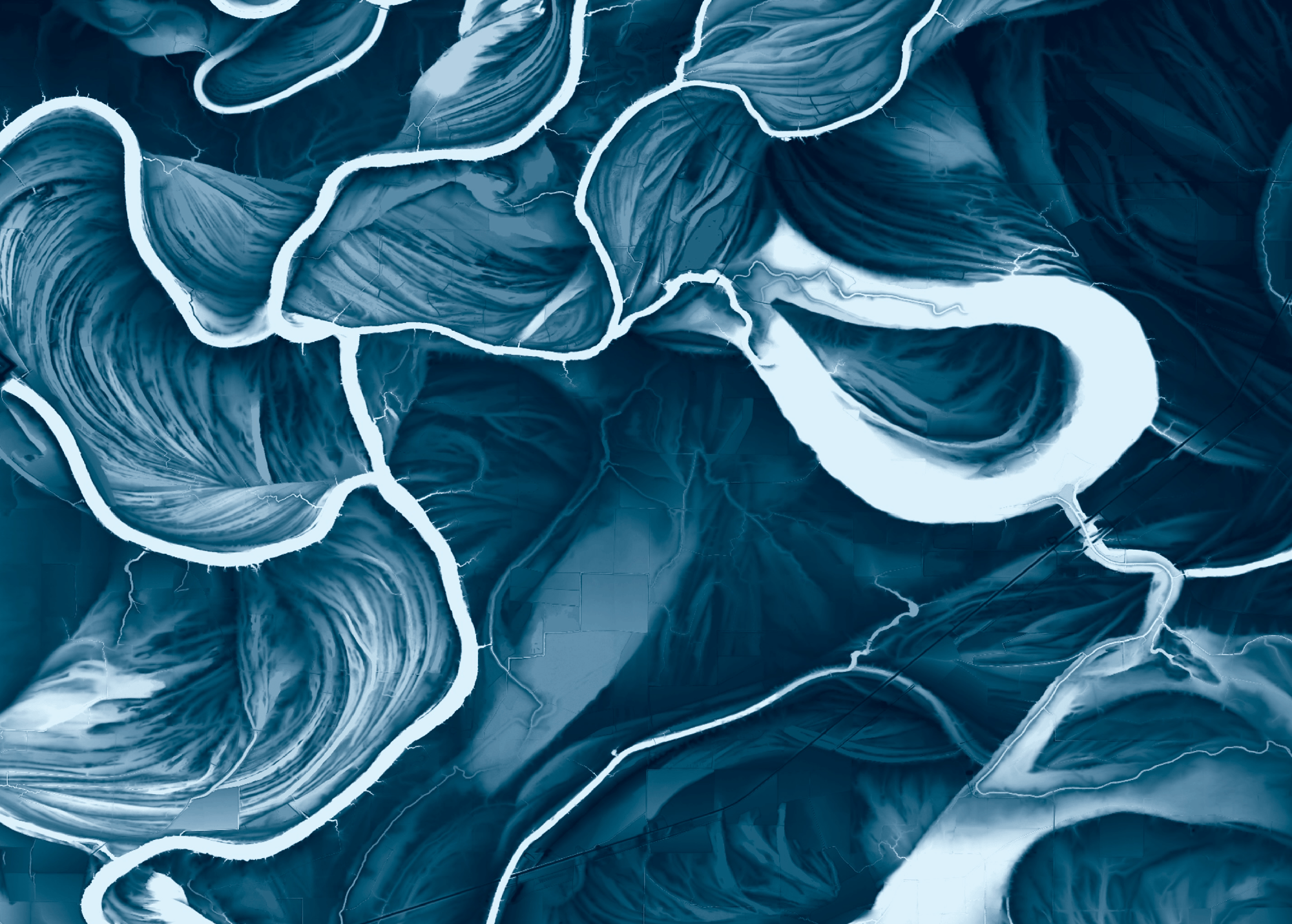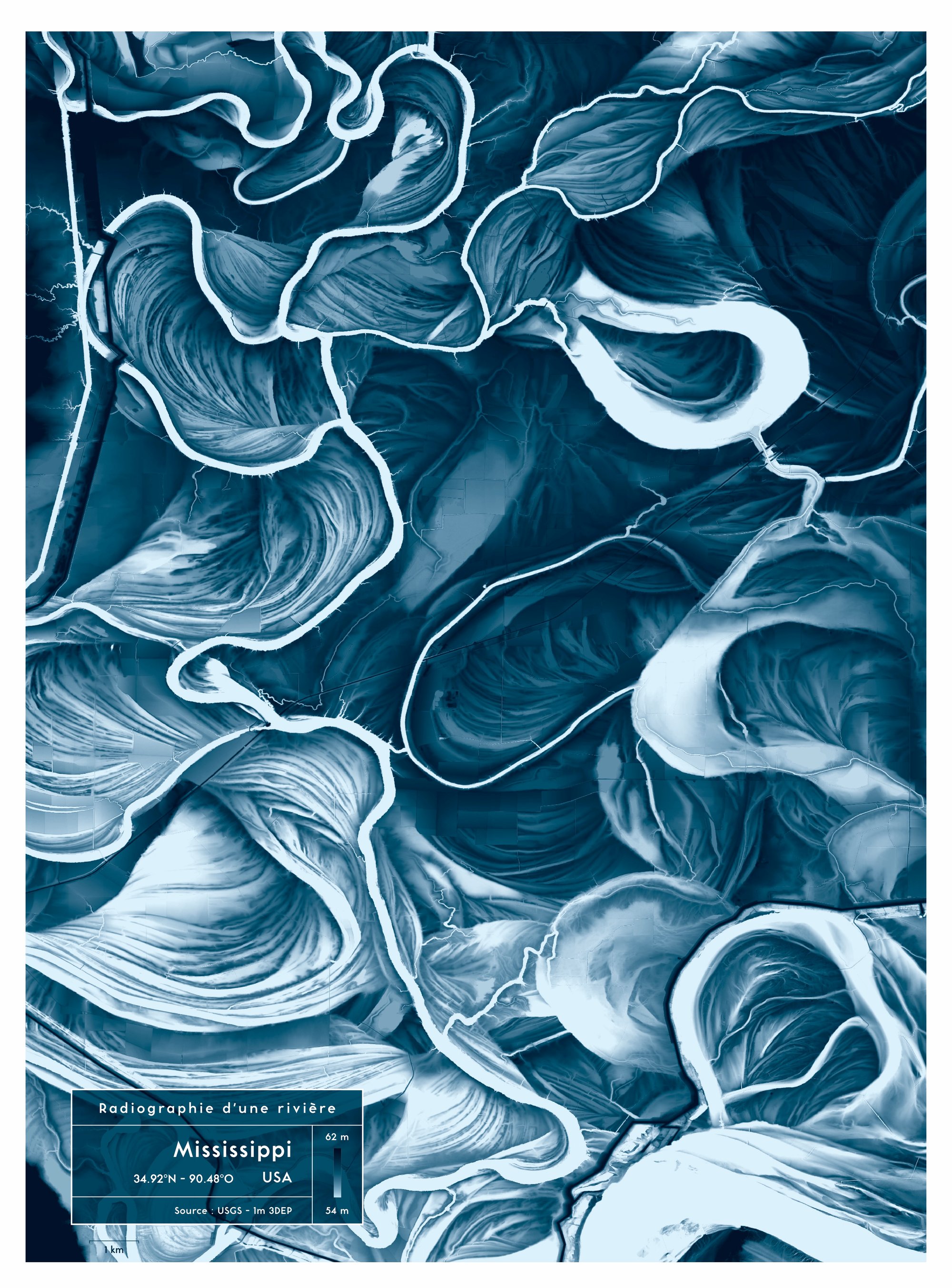 Visualisation des méandres du Mississippi et de ses affluents de la rive droite, dans l'Arkansas, à 40 km au sud-est de Memphis. Cette image a été réalisée à partir du modèle numérique de terrain de l'USGS (1m 3DEP). Le filtrage des données d'altimétrie permet de révéler les plus fines variations du paysage dans le lit des rivières